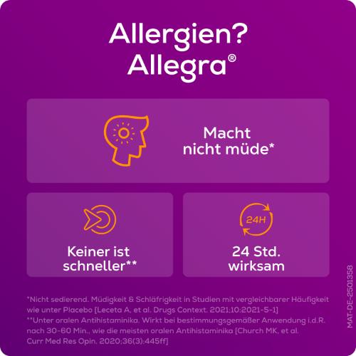 Allegra® Allergietabletten 20 mg Tabletten. Wirkstoff: Bilastin. Anwendungsgebiet: Antihistaminikum. Zur Linderung der Beschwerden allergischer Rhinokonjunktivitis und Urtikaria. Apothekenpflichtig.