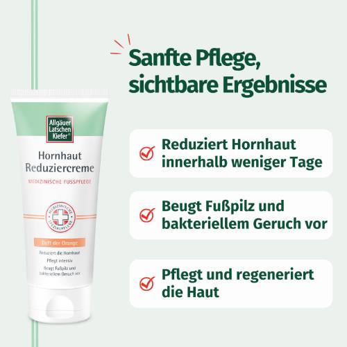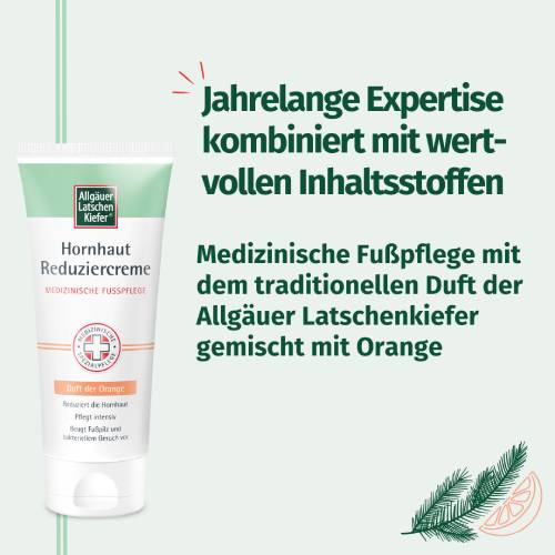 Die Hornhaut Reduziercreme Orange von Allgäuer Latschenkiefer ist eine Fußpflege, die jahrelange Expertise mit wertvollen Inhaltsstoffen kombiniert. Sie wirkt sanft, aber dennoch effektiv bei der Reduzierung unerwünschter Hornhaut . Ihre Anti-Hornhaut-Formel kombiniert wertvolle Fruchtsäuren, wie Salicyl- und Glykolsäure, um Hornhaut gezielt zu reduzieren und das Hautbild sichtbar zu verbessern – und das bereits innerhalb weniger Tage.