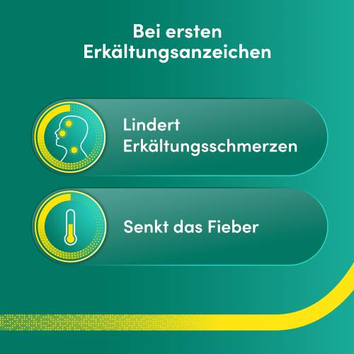 Anwendungsgebiete: Leichte bis mäßig starke Schmerzen wie Kopfschmerzen; Zahnschmerzen; Regelschmerzen; schmerzhafte Beschwerden, die im Rahmen von Erkältungskrankheiten auftreten (z. B. Kopf-, Hals- und Gliederschmerzen); Fieber.