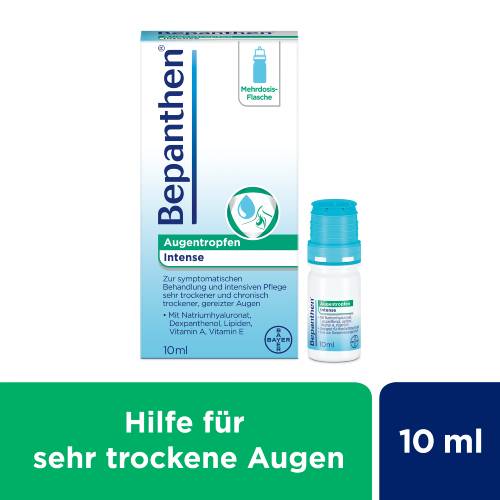 Die neuen Bepanthen® Augentropfen Intense bieten eine wirksame Hilfe bei sehr trockenen Augen oder chronisch trockenen Augen. Durch die enthaltenen Inhaltsstoffe und den besonderen Lipid-Schutzschild-Komplex schützen Bepanthen® Augentropfen Intense vor der vorzeitigen Verdunstung des Tränenfilms und sorgen für eine langanhaltende Befeuchtung. Damit beruhigen Bepanthen® Augentropfen Intense sehr trockene Augen sowie chronisch trockene Augen und lindern die Beschwerden.