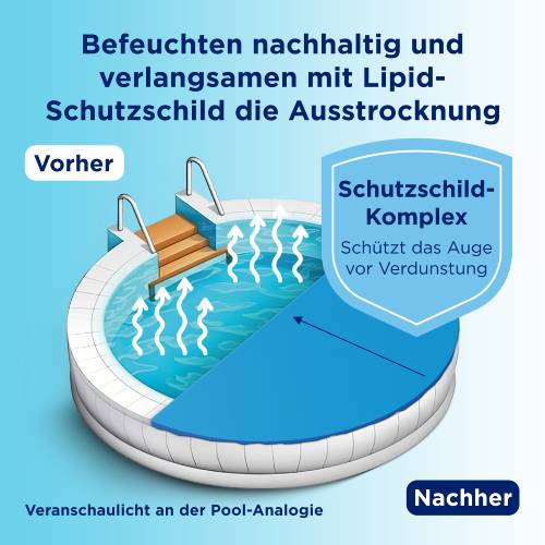 ● Phospholipide, die Teil des besonderen Lipid-Schutzschild-Komplexes sind, regenerieren den Fettanteil im Tränenfilm und helfen, die wichtige Lipidschicht wiederherzustellen. Eine zu starke Verdunstung des Tränenfilms wird so verhindert.