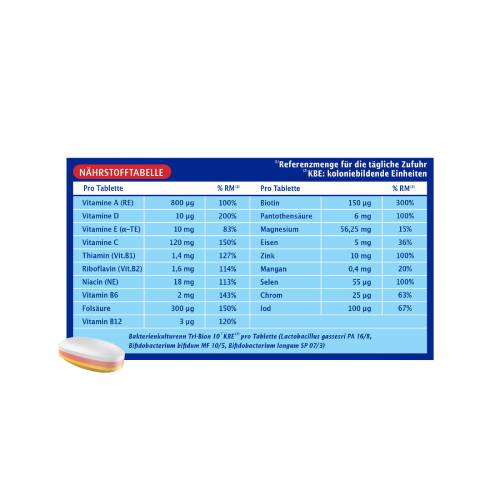 Bion3 Immun enthält 3 lebende Bakterienkulturen: Lactobacillus gasseri, Bifidobacterium bifidum und Bifidobacterium longum. Die Tri-Bion Technologie schützt die Bakterien mit einer speziellen Beschichtung vor der Magensäure und sorgt so dafür, dass diese den Darm lebend erreichen können. Außerdem enthält Bion3 Immun 7 ausgewählte Mineralstoffe und 12 Vitamine. Gib deinem Immunsystem die Unterstützung, die es braucht mit Vitamin A, C, D, B6, B12 und Folsäure und Eisen, Zink und Selen*