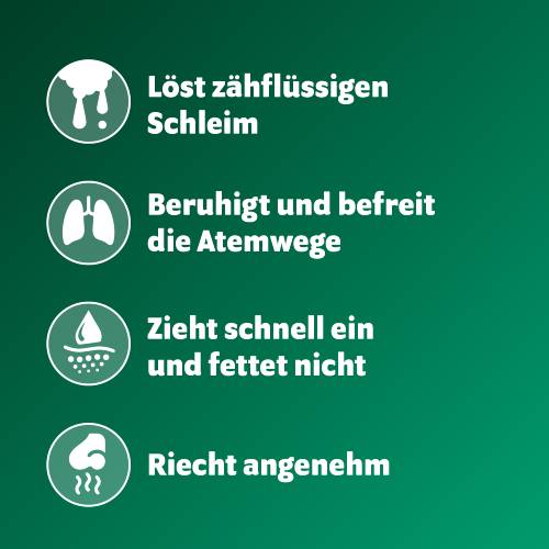 Die Inhaltsstoffe entstammen mehreren Pflanzen und wirken als natürliches Gemisch. Die Inhaltsstoffe bewirken im Anwendungsgebiet eine vermehrte Durchblutung und eine Schleimlösung. Eucalyptusöl regt zudem die feinen Härchen der oberen Atemwege zu schnelleren Bewegungen an. Dadurch kann festsitzender Schleim besser abtransportiert und das Abhusten erleichtert werden. Es vermindert außerdem den Hustenkrampf.