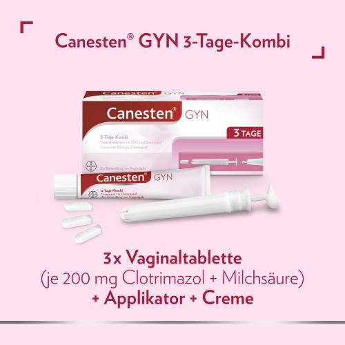 In der Canesten® GYN 3-Tage-Kombi ist der Wirkstoff Clotrimazol enthalten (Vaginaltablette: 200 Milligramm; 1 Gramm Creme: 10 Milligramm). Clotrimazol greift die Erreger (sowohl Pilze als auch Bakterien) an und hemmt deren Vermehrung. Die Symptome werden dadurch ebenfalls gelindert. Ein spezieller Milchsäurezusatz verbessert die Löslichkeit und erhöht die Verfügbarkeit des Wirkstoffs. In einer Packung Canesten® GYN 3-Tage-Kombi sind ein Aluminiumblister mit drei Vaginaltabletten und separatem Applikator sowie eine Aluminiumtube mit 20 Gramm Creme enthalten.