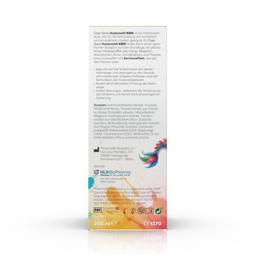 Casa Sana HUSTENSAFT KIDS ist ein hochwertiges pflanzliches Medizinprodukt, das für die Behandlung von trockenem und produktivem Husten geeignet ist und für Kinder ab 3 Jahren entwickelt wurde. Das Präparat bildet dank seiner spezifischen Rezeptur auf der Grundlage von Honig und pflanzlichen Inhaltsstoffen wie Wegerich, isländischem Moos, Grindeliakraut und Propolis, die reich an Schleimstoffen sind, einen Schutzfilm mit Barriere-Effekt, der auf drei Ebenen wirkt: