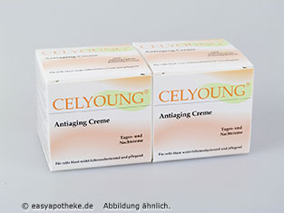 Celyoung Antiaging Creme wird angewandt zur täglichen Pflege der reiferen Haut.Die Creme steigert den Feuchtigkeitsgehalt der Haut und sorgt für eine Reduzierung tiefer liegender Falten. Die Feuchtigkeit wird langanhaltend gespeichert, und die Haut fühlt sich geschmeidiger und jünger an. Die Elastizität der Haut verbessert sich spürbar. Der Collagenaufbau wird gesteigert und erneuter Faltenbildung vorgebeugt. Celyoung Antiaging Creme reduziert somit wesentlich die Zeichen vorzeitiger Hautalterung.