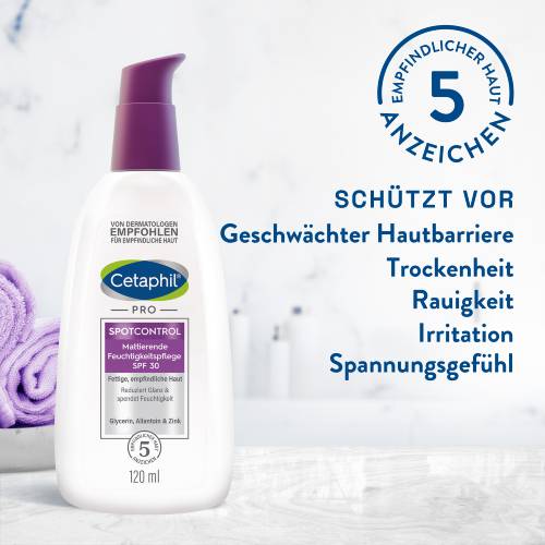 Cetaphil PRO SpotControl Mattierende Feuchtigkeitspflege SPF 30 wurde speziell für die Bedürfnisse fettiger und unreiner Haut entwickelt. Die leichte 3-in-1 Feuchtigkeitspflege reduziert Glanz und Hautunreinheiten, spendet langanhaltend Feuchtigkeit und schützt dank hohem Lichtschutzfaktor vor UVA- und UVB-Strahlen. Für ein gepflegtes und ebenmäßiges Hautbild. Die Feuchtigkeitspflege ist auch zur begleitenden Pflege während der Akne-Therapie geeignet.1 Dermatologische und hautphysiologische Untersuchungen bestätigen die sehr gute Verträglichkeit bei zu Akne und Unreinheiten neigender Haut. Nicht komedogen. Ohne Duftstoffe.