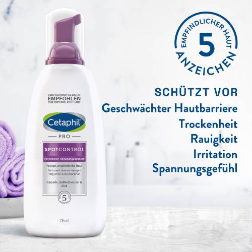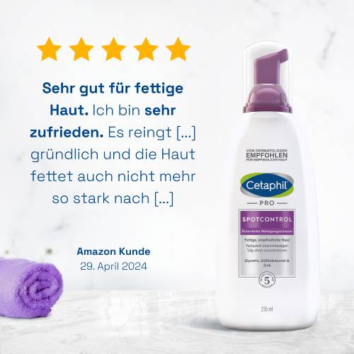 Der erfrischende Cetaphil PRO SpotControl Reinigungsschaum befreit die Haut effektiv von überschüssigem Talg und Schmutzpartikeln. Die seifenfreie Formulierung reinigt porentief ohne auszutrocknen und schont die natürliche Hautbarriere. Für ein klares und gepflegtes Hautbild. Der Schaum ist auch zur begleitenden Reinigung während der Akne-Therapie geeignet. Dermatologische und hautphysiologische Untersuchungen bestätigen die effektive Reinigungswirkung und sehr gute Verträglichkeit bei zu Akne und Unreinheiten neigender Haut. Nicht komedogen.