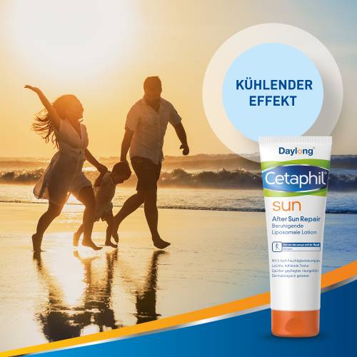 Cetaphil Sun Daylong After Sun ist eine kühlende Pflegelotion zur Beruhigung sonnengestresster Haut. Hierbei hilft der besondere 5-fach Feuchtigkeitskomplex. Er pflegt und beruhigt die Haut mit natürlichen Inhaltsstoffen. Glycerin, Dexpanthenol und Vitamin E spenden der Haut intensive Feuchtigkeit. Wertvolle Sheabutter und Phytosqualen stärken die angegriffene Barrierefunktion der Haut. Die leichte Formulierung zieht schnell ein, klebt und fettet nicht und hinterlässt ein erfrischtes, spürbar gepflegtes Hautgefühl.