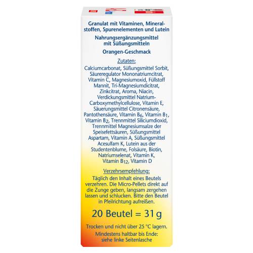 Calciumcarbonat, Süßungsmittel Sorbit, Säureregulator Mononatriumcitrat, Vitamin C, Magnesiumoxid, Füllstoff Mannit, Tri-Magnesiumdicitrat, Zinkcitrat, Aroma, Niacin, Verdickungsmittel Natrium-Carboxymethylcellulose, Vitamin E, Säuerungsmittel Citronensäure, Pantothensäure, Vitamin B6, Vitamin B1, Vitamin B2, Trennmittel Siliciumdioxid, Trennmittel Magnesiumsalze der Speisefettsäuren, Süßungsmittel Aspartam, Vitamin A, Süßungsmittel Acesulfam K, Lutein aus der Studentenblume, Folsäure, Biotin, Natriumselenat, Vitamin K, Vitamin B12, Vitamin D
