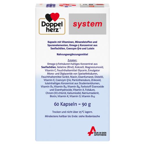 Doppelherz system A-Z + Omega-3 enthält sorgfältig aufeinander abgestimmte Vitamine, Mineralstoffe und Spurenelemente – von Vitamin A bis Zink. Zusätzlich enthalten: Coenzym Q10, Lutein und Omega-3 aus hochgereinigten Seefischölen.