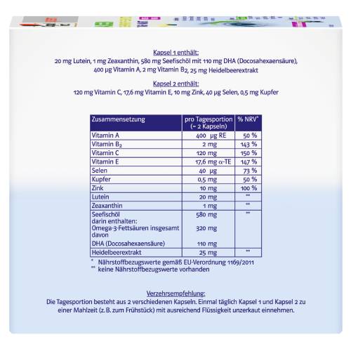 Kapsel 1 trägt mit Vitamin A zum Erhalt der normalen Sehkraft bei. Zusätzlich ist die Omega-3-Fettsäure DHA in Kombination mit Lutein, Zeaxanthin und Heidelbeerextrakt enthalten. Das fettlösliche Vitamin A und das wasserlösliche Vitamin B2 leisten einen Beitrag zum Erhalt der normalen Sehkraft. Vitamin B2 trägt zum Erhalt der normalen Schleimhäute bei. Lutein und Zeaxanthin kommen vor allem in pflanzlichen Lebensmitteln (z. B. grünem Gemüse) vor. Der so genannte „Gelbe Fleck“ der Netzhaut enthält eine hohe Konzentration an Lutein und Zeaxanthin. Der „Gelbe Fleck“ liegt in der Mitte des Augenhintergrundes. Heidelbeeren sind eine beliebte Beerensorte in der menschlichen Ernährung. Sie wurden bereits vor Jahrhunderten in den Wäldern und Mooren Europas gesammelt und wegen ihrer Inhaltsstoffe geschätzt. Die Omega-3-Fettsäure DHA (Docosahexaensäure) kommt in den Sehzellen der Netzhaut vor. Die Kapseln von Doppelherz system enthalten eine besonders hohe Konzentration an Omega-3-Fettsäuren. Das Omega-3-Konzentrat erreicht einen Omega-3-Fettsäuren-Anteil von 55 %. In herkömmlichen Fischölprodukten sind nur etwa 30 % enthalten. Dabei sind es gerade die Omega-3-Fettsäuren, die die Fischöle so wertvoll machen.