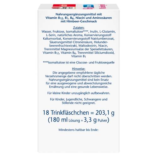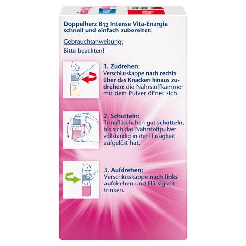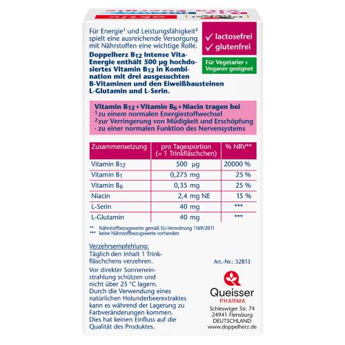 Doppelherz B12 Intense Vita-Energie enthält 500 μg hochdosiertes Vitamin B12 in Kombination mit drei ausgesuchten B-Vitaminen und den Eiweißbausteinen L-Glutamin und L-Serin. Für Energie und Leistungsfähigkeit spielt eine ausreichende Versorgung mit Nährstoffen eine wichtige Rolle. Vitamin B12 + Vitamin B6 + Niacin tragen bei zu einem normalen Energiestoffwechsel, zu einer normalen Funktion des Nervensystems sowie zur Verringerung von Müdigkeit und Erschöpfung bei.