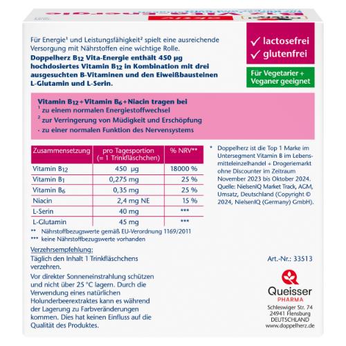 Doppelherz B12 Vita-Energie enthält 450 μg hochdosiertes Vitamin B12 in Kombination mit drei ausgesuchten B-Vitaminen und den Eiweißbausteinen L-Glutamin und L-Serin. Das Vitamin B12 ist ein Multitalent für Energie und Gesundheit. Es trägt unter anderem zur Verringerung von Müdigkeit und Erschöpfung bei und unterstützt eine normale Funktion des Immunsystems. Vitamin B1 leistet einen Beitrag zum normalen Energiestoffwechsel. Es unterstützt außerdem die normale Herzfunktion und leistet auch einen Beitrag für die normale Funktion des Nervensystems. Auch das Vitamin B6 übernimmt viele Aufgaben im Stoffwechsel, unter anderem, die Aktivierung von Aminosäuren, den Bausteinen der Nahrungsproteine, die mit seiner Hilfe in körpereigene Proteine eingebaut werden können. Vitamin B6 trägt zu einem normalen Eiweißstoffwechsel bei. Außerdem beeinflusst Vitamin B6 Funktionen des Nervensystems, der Immunabwehr und der Hämoglobinsynthese.
