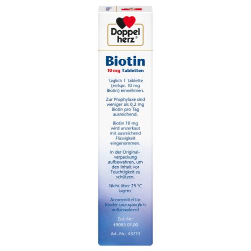 Doppelherz Biotin 10 mg Tabletten zum Einnehmen ist ein Arzneimittel mit dem Wirkstoff Biotin. Biotin, auch Vitamin H genannt, hat eine wichtige Funktion im Stoffwechsel der Haarwurzeln und des Nagelbettes. Es fördert die Bildung neuer Haar- und Nagelsubstanz aus dem Bindegewebsbaustein Keratin. Haare und Nägel wachsen nur langsam - bis sich ein Nagel komplett erneuert hat, dauert es ein halbes Jahr und auch Haare wachsen im Monat nur etwa einen Zentimeter. Schuppige und trockene Haut, stumpfes Haar oder weiche, brüchige Nägel können ein Anzeichen für einen Biotin-Mangel sein. Bei einseitigen Diäten, in der Schwangerschaft oder Stillzeit, bei Rauchern und Personen mit erhöhtem Alkoholkonsum ist die Biotinversorgung nicht immer optimal.