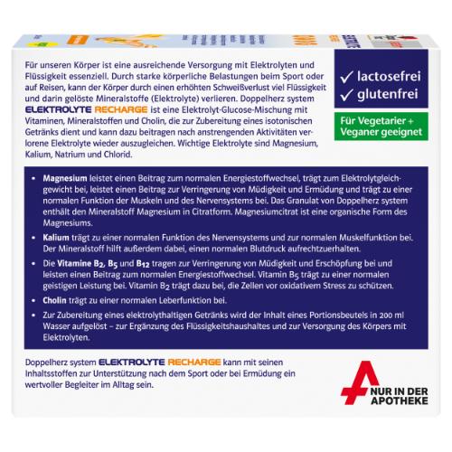 Doppelherz system ELEKTROLYTE RECHARGE ist eine Elektrolyt-Glucose-Mischung mit Vitaminen, Mineralstoffen und Cholin, die zur Zubereitung eines isotonischen Getränks dient. Ob im Beruf, beim Sport oder in der Freizeit – durch intensive Bewegung und starkes Schwitzen kann es zu Verlusten im Wasser- und Elektrolythaushalt kommen. Doppelherz system ELEKTROLYTE RECHARGE kann helfen, diese Verluste wieder auszugleichen. Für unseren Körper ist eine ausreichende Versorgung mit Elektrolyten und Flüssigkeit essenziell. Verliert der Körper schnell viel Flüssigkeit, werden Elektrolyte ausgeschwemmt. Elektrolyte, besonders Natrium, helfen dem Körper dabei den Flüssigkeitshaushalt wieder auszugleichen. Das enthaltene Magnesium trägt zum Elektrolytgleichgewicht bei. Außerdem tragen die Vitamine B2, B5 und B12 zur Verringerung von Müdigkeit und Erschöpfung bei und unterstützen den normalen Energiestoffwechsel. Kalium trägt zu einer normalen Funktion des Nervensystems und zur normalen Muskelfunktion bei. Cholin trägt zu einer normalen Leberfunktion bei. Das macht Doppelherz system ELEKTROLYTE RECHARGE zu einem idealen Begleiter nach dem Sport und bei starker körperlicher Arbeit.