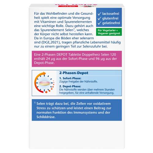 Eine 2-Phasen DEPOT Tablette Doppelherz Selen 120 enthält 24 µg aus der SofortPhase und 96 µg aus der Depot-Phase. Für das Wohlbefinden und die Gesundheit spielt eine optimale Versorgung mit Vitaminen und Spurenelementen eine wichtige Rolle. Dazu gehört auch das Spurenelement Selen, welches der Körper nicht selbst herstellen kann. Da in Europa die Böden oftmals selenarm sind (DGE,2021), tragen pflanzliche Lebensmittel häufig nur zu einem geringen Teil zur Selenzufuhr bei. Selen trägt dazu bei, die Zellen vor oxidativem Stress zu schützen und leistet einen Beitrag zur normalen Funktion des Immunsystems und der Schilddrüse