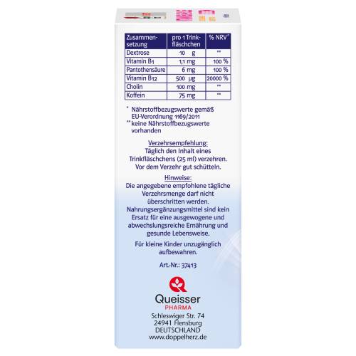 Ausreichende körperliche Bewegung sowie eine gesunde und ausgewogene Ernährung sind Voraussetzung für körperliche Aktivität und geistige Fitness bis ins hohe Alter. Für Gesundheit und Leistungsfähigkeit spielt eine ausreichende Versorgung mit Nährstoffen eine wichtige Rolle. Unser Körper kann diese Nährstoffe oft nicht selbst bilden. Sie müssen täglich mit der Nahrung aufgenommen werden. Bei unausgewogener Ernährung oder erhöhtem Bedarf kann es zu Versorgungslücken kommen. Doppelherz system enthält 10 g Dextrose, 500 μg Vitamin B12, 75 mg Koffein, 100 mg Cholin, Vitamin B1 und Pantothensäure. Die aufeinander abgestimmten Nährstoffe sind im praktischen Trinkfläschchen enthalten – sofort trinkfertig mit leckerem Orange-Grapefruit-Geschmack – ideal für