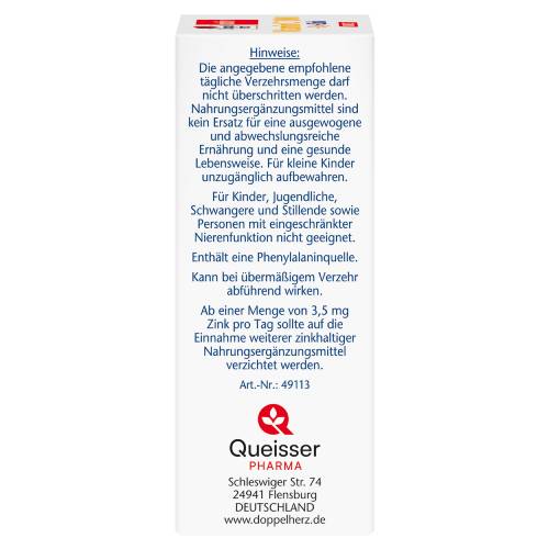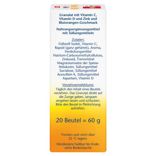 Doppelherz Vitamin C 1000 + D3 + Zink kombiniert drei Nährstoffe in einem Produkt. Mit nur einem Portionsbeutel täglich lässt sich so zu einer normalen Funktion des Immunsystems beitragen. Vitamin C und Zink tragen zum Schutz der Zellen vor oxidativem Stress bei. Vitamin D trägt zur Erhaltung normaler Knochen sowie zur normalen Muskelfunktion bei.Ein stabiles Immunsystem ist die Grundvoraussetzung für unsere Gesundheit. Nicht nur in den kalten Jahreszeiten, sondern auch unter Belastungen (z. B. körperliche Anstrengungen) kann unser Immunsystem gefordert werden. Der Bedarf an Nährstoffen, die hierfür eine Rolle spielen, kann dadurch erhöht sein. Da der Körper Zink und Vitamin C  nicht selbst bilden kann, müssen diese Nährstoffe regelmäßig über die Nahrung aufgenommen werden. Vitamin D kann unser Körper durch die Einwirkung von Sonnenlicht auf die Haut selbst bilden. Diese Eigenproduktion reicht in unseren Breitengraden, insbesondere im Winter, jedoch häufig nicht aus. Ein Portionsbeutel enthält 1000 mg Vitamin C (hochdosiert), 20 µg Vitamin D3 (entspricht 800 Internationalen Einheiten; I. E.) und 10 mg Zink. Das Produkt schmeckt angenehm fruchtig nach Blutorange, ist zuckerfrei, für Vegetarier geeignet sowie lactose- und glutenfrei.