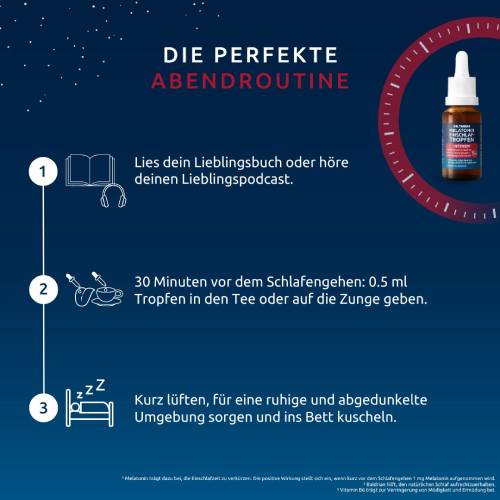 Die Tropfen bringen eine neue, innovative Form der Anwendung mit sich, da sie entweder direkt auf die Zunge oder in den Abendtee gegeben werden können – eine praktische Alternative zu bisherigen Einschlafhilfen wie Melatonin Sprays, Melatonin Tabletten oder Melatonin Gummies.