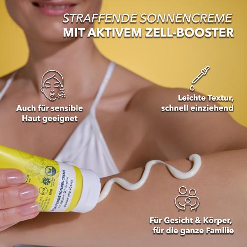 Entdecken Sie die straffende Sonnencreme mit Zell-Booster, die Hautpflege und Sonnenschutz intelligent vereint – ideal für Gesicht und Körper. Die vegane Formulierung schützt mit LSF 50 sowie UVA- und UVB-Filter vor Sonneneinstrahlung und Blue Light, während 4 % Niacinamide die Hautstruktur unterstützen und Feuchtigkeit spenden.