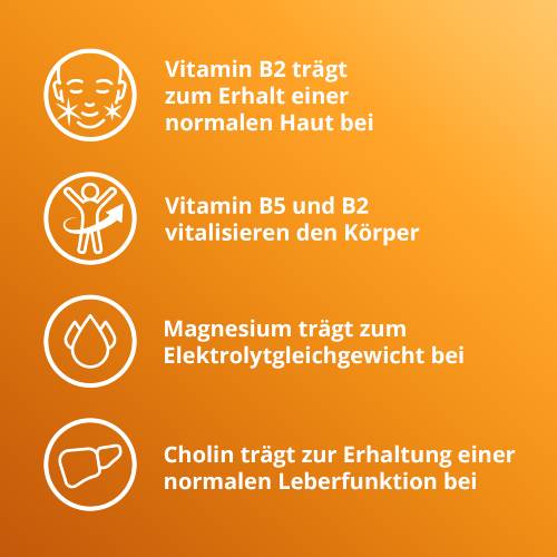 Pantothensäure (Vitamin B5) und Riboflavin (Vitamin B2) vitalisieren den Körper, indem sie zur Verringerung von Müdigkeit und Ermüdung und zu einem normalen Energiestoffwechsel beitragen. Zusätzlich dazu trägt Pantothensäure zu einer normalen geistigen Leistung bei, Riboflavin trägt zum Erhalt einer normalen Haut bei und dazu, die Zellen vor oxidativem Stress zu schützen. Cholin trägt zur Erhaltung einer normalen Leberfunktion bei.