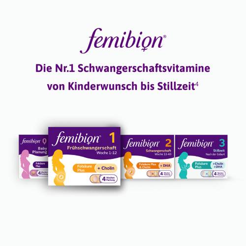 ⁶Femibion® ist die einzige Marke in Deutschland mit Folsäure Plus (eine Kombination aus Folsäure und Metafolin®) und Cholin.