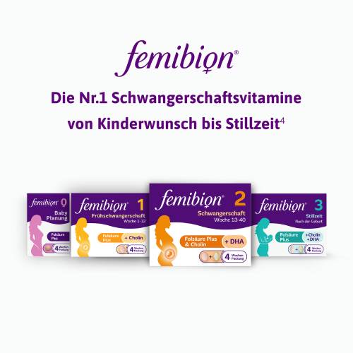 1 Femibion®-Produkte enthalten Folat (Folsäure & Metafolin®) & weitere ausgewählte Nährstoffe; Femibion® 2 & 3 enthalten außerdem Docosahexaensäure (DHA). Die ergänzende Aufnahme von Folsäure erhöht bei Schwangeren den Folatspiegel. Ein niedriger Folatspiegel bei Schwangeren ist ein Risikofaktor für die Entstehung von Neuralrohrdefekten beim heranwachsenden Fötus. Dafür sollten zusätzlich täglich 400 μg Folsäure über einen Zeitraum von mindestens einem Monat vor und bis zu drei Monaten nach der Empfängnis eingenommen werden. Ein Neuralrohrdefekt ist durch mehrere Risikofaktoren bedingt. Die Veränderung eines Risikofaktors kann eine positive Wirkung haben oder auch nicht. Folat trägt zum Wachstum des mütterlichen Gewebes während der Schwangerschaft bei, einschließlich der Entwicklung der Plazenta. Die Einnahme von DHA (mehrfach ungesättigte Omega-3-Fettsäure) durch die Mutter trägt zur normalen Entwicklung des Gehirns und der Augen des Fötus und gestillten Säuglings bei. Die positive Wirkung von DHA tritt ein, wenn zusätzlich zu der für Erwachsene empfohlenen Tagesdosis an Omega-3-Fettsäuren (d.h. 250 mg DHA und EPA) täglich 200 mg DHA eingenommen werden.