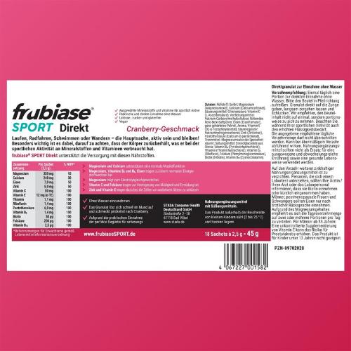 Aus viel Bewegung und Sport resultiert ein erhöhter Mikronährstoffbedarf. Beim Schwitzen gehen außerdem Salze und Mineralstoffe verloren. frubiase® SPORT DIREKT gibt dem Körper zurück, was er beim Sport verbraucht, und deckt den erhöhten Bedarf mit einer ausgewählten Kombination aus Mineralstoffen, Vitaminen und Spurenelementen. Es enthält für Sportler wichtiges Magnesium, Vitamin C, Vitamin E sowie u.a. wertvolle B-Vitamine.