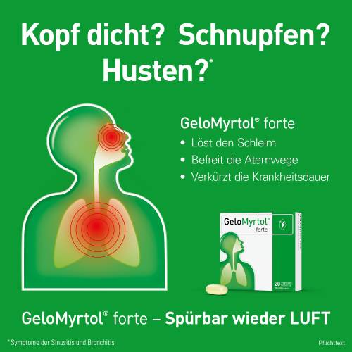 Pflichttexte GeloMyrtol® forte GeloMyrtol® forte. Anw.: Zur Schleimlösung u. Erleichterung des Abhustens b. akuter u. chron. Bronchitis. Zur Schleimlösung b. Entzündungen der Nasennebenhöhlen (Sinusitis). Z. Anw. b. Erwachsenen, Jugendlichen u.