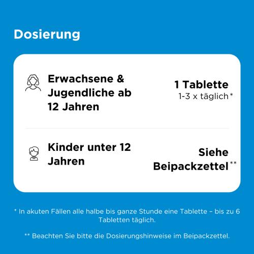 | Jugendliche ab 12 Jahren und Erwachsene | 1 Tablette | bis zu 6-mal täglich (maximal) | im Abstand von 1/2-1 Stunde, unabhängig der Mahlzeit |