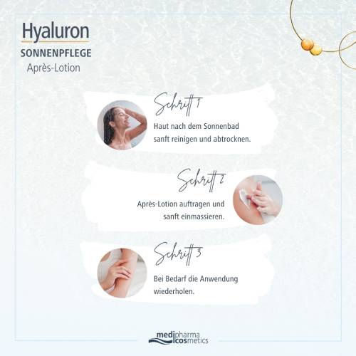 Nicht erst bei Sonnenbrand der Haut etwas Gutes tun: Es ist ratsam, eine After Sun Lotion nicht erst nach einem Sonnenbrand oder bei geröteter Haut, anzuwenden, sondern nach jedem Sonnenbad. Die Haut trocknet durch die Kraft der Sonne und deren Hitze schneller aus. Das Auftragen der Hyaluron Sonnenpflege Après-Lotion von medipharma cosmetics kann helfen, die Haut geschmeidig und gesund zu halten und vorzeitiger Hautalterung vorzubeugen.