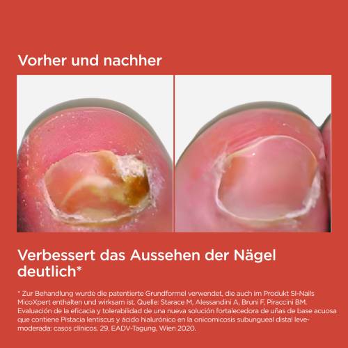 SI-NAILS® MicoXpert ist ein Medizinprodukt zur Behandlung und Prävention von milden bis moderaten Pilzinfektionen der Hand- und Fußnägel. Es ist bei den häufigsten nagelbefallenden Pilzarten wirksam: Dermatophyten (Tinea unguium; Nagelpilz), Hefen (Candidose der Nägel), Fadenpilzen und Schimmelpilzen. Außerdem trägt das Produkt dazu bei, das Erscheinungsbild der Nägel und Nagelhaut zu verbessern und die gelbe Verfärbung, die bei Pilzinfektionen auftreten kann, zu reduzieren.