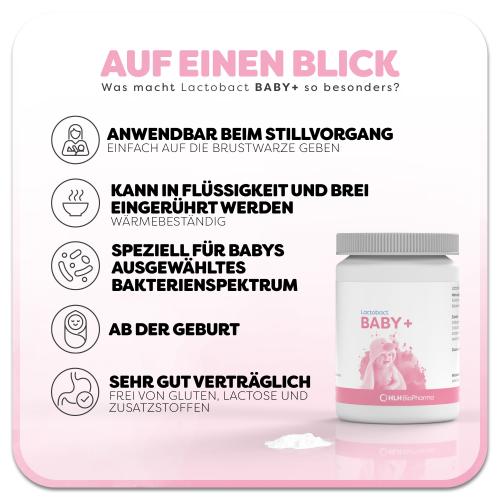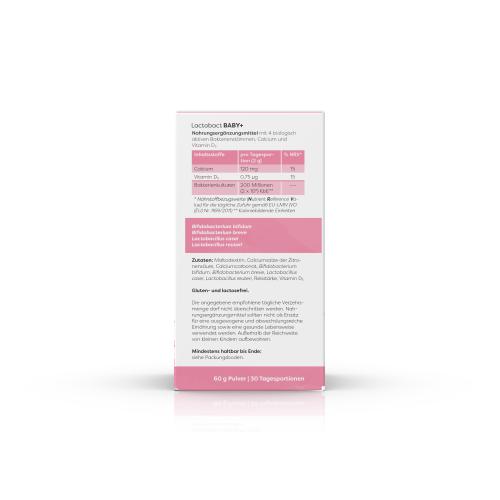 Die enthaltenen Bakterienstämme Bifidobacterium bifidum, Bifidobacterium breve, Lactobacillus casei und Lactobacillus reuteri sind speziell auf die Bedürfnisse von Säuglingen abgestimmt und unterstützen den Darm, stärken das Immunsystem und fördern die körperliche Entwicklung. Das Probiotikum ist sehr gut verträglich, wird in Deutschland produziert und ist für Babys und Kleinkinder bis zu 2 Jahren geeignet. Sämtliche Inhaltsstoffe unterliegen strengen Kontrollen, und es wird bewusst auf schädliche Füll- und Zusatzstoffe verzichtet. Die biologisch aktiven Mikroorganismen in Lactobact BABY + sind durch die Intelicaps-Mikroverkapselungstechnologie, einen pflanzlichen Überzug, auch vor Magen- und Gallensäure geschützt. So kann das Pulver in ein warmes Fläschchen oder den Brei eingerührt werden, und die nützlichen Bakterien erreichen unbeschadet den Darm und die Vermehrungsfähigkeit wird nicht beeinträchtigt. Wir empfehlen die Anwendung des Präparats im Rahmen einer 2- oder 3-Monatskur.