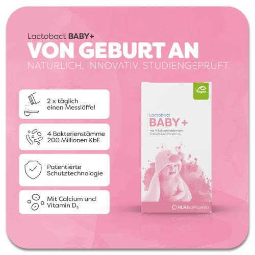 Lactobact BABY + ist ein spezifisches probiotisches Pulver für Babys und Kleinkinder in Apothekenqualität, das sich durch 4 wissenschaftlich ausgewählte, mikroverkapselte Bakterienkulturen sowie die wichtigen Nährstoffe Calcium und Vitamin D3 auszeichnet. Das Darm-Probiotikum wird traditionell zum Darmaufbau, zur Förderung einer gesunden Darmflora sowie zur Unterstützung bei Bauchkrämpfen, Koliken und Verdauungsbeschwerden eingesetzt und stärkt gezielt die körperliche Entwicklung von Kindern ab der Geburt – auch besonders geeignet für Kaiserschnittgeburten, nicht gestillte Babys und Frühchen. Therapeuten empfehlen das Präparat zur gezielten Stabilisierung der Darmflora, zur Unterstützung des darmassoziierten Immunsystems während Antibiotika-Therapien und Impfungen sowie zur Prävention und Behandlung von Allergien und Unverträglichkeiten. Die gezielte Kombination aus nützlichen Bakterien und essenziellen Nährstoffen unterstützt die Entwicklung des Babys von Geburt an. Das Muskel- und Knochenwachstum wird unterstützt, die normale Entwicklung der Zähne wird begünstigt und ein funktionierender Energiestoffwechsel wird gefördert.
