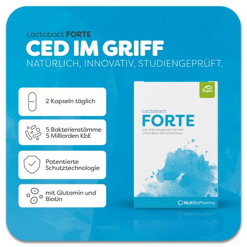 Lactobact FORTE ist ein Lebensmittel für besondere medizinische Zwecke und ist auf die vielfältigen Mechanismen chronisch-entzündlicher Darmerkrankungen (CED) ausgerichtet. Die besondere Zusammensetzung von Lactobact FORTE aus 5 wissenschaftlich ausgewählten Bakterienkulturen und den wichtigen Inhaltsstoffen Biotin und Glutamin ist auf die speziellen Anforderungen der von Darmentzündungen betroffenen Personen entwickelt worden. Das Präparat unterstützt das darmassoziierte Immunsystem, zeichnet sich durch anti-entzündliche Eigenschaften aus und stellt eine natürliche Hilfe bei einer entzündeten Darmschleimhaut dar. Lactobact FORTE stärkt die Darmbarriere sowie die Darmschleimhaut und kann dadurch die entzündungsfreien Phasen (Remission) bei chronisch-entzündlichen Darmerkrankungen (CED) verlängern.