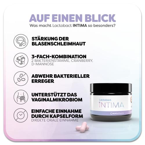 Lactobact INTIMA bietet eine zielgerichtete Unterstützung, wenn eine Blasenentzündung oder ein Harnwegsinfekt vorliegt und die Vaginalflora im Ungleichgewicht ist. Es kann auch von Männern verwendet werden. Präparate von HLH BioPharma sind klinisch getestet, werden regelmäßig von unabhängigen Laboren in Deutschland überprüft und stammen aus nachhaltiger, zertifizierter Produktion mit höchsten Qualitätsstandards. Gesundheitsexperten im In- und Ausland, vor allem Apotheker, Hebammen, Ärzte, Heilpraktiker, Ökotrophologen und Ernährungsberater, vertrauen auf die hervorragend bewerteten, nach pharmazeutischen Kriterien hergestellten Präparate von HLH BioPharma.
