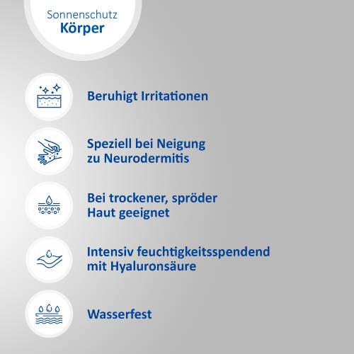 Personen mit Neurodermitis leiden oft unter sehr trockener, rauer Haut. Daher benötigen sie Produkte mit einer speziellen Rezeptur, welche dabei hilft, die Haut nicht nur zu schützen, sondern auch zu pflegen. Zusätzlich sollten Produkte gewählt werden, die keine relevanten Reizstoffe oder Kontaktallergene enthalten. Die Ladival® Trockene Haut Serie erfüllt die besonderen Ansprüche von zu Neurodermitis neigender & sehr trockener Haut. Dabei verleihen die Produkte ein angenehmes Hautgefühl, ohne zu kleben.