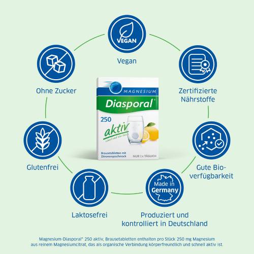 Die Magnesium Diasporal 250 aktiv Brausetabletten werden zur Behandlung eines nachgewiesenen Magnesiummangels angewendet, wenn dieser Mangel Ursache für Störungen der Muskeltätigkeit ist. Die Brausetabletten enthalten als einzigen Wirkstoff reines Magnesiumcitrat. Zu den durch einen Magnesiummangel hervorgerufenen Störungen gehören unter anderem neuromuskuläre Störungen, Verspannungen und Wadenkrämpfe. Das Magnesium beeinflusst Nervenreize und Muskelbewegungen. Ein Magnesiummangel kann zum Beispiel durch Mangelernährung, Aufnahmestörungen und erhöhtem Verbrauch verursacht werden. Die Magnesium Diasporal 250 aktiv Brausetabletten ermöglichen grundlegende Stoffwechselvorgänge im Körper, wie die Nutzung von Fetten und Kohlenhydraten.