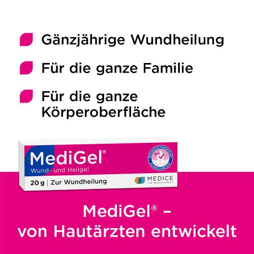 Effektiv und für akute Wunden geeignet: Das ist MediGel® Wund- und Heilgel. Das hydroaktive Lipogel, das eigens von Hautärzten entwickelt wurde, trägt mit Zink- und Eisenionen zu einem pH-Wert-optimierten Wundklima bei und fördert so den natürlichen Heilungsprozess bei Wunden. Gleichzeitig wird sowohl das Infektionsrisiko als auch die Narbenbildung verringert. Dabei optimiert MediGel® die Prinzipien der feuchten Wundheilung – ohne Kruste, ohne Spannungsschmerz.