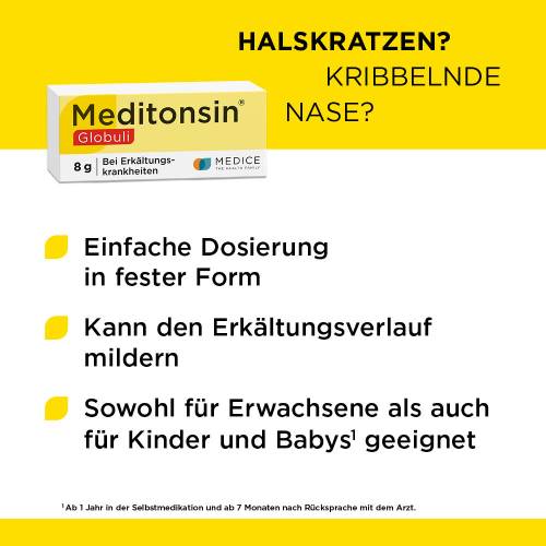 Nach Rücksprache mit dem Arzt kann Meditonsin® bereits Säuglingen ab sieben Monaten verabreicht werden. Kleinkinder ab einem Jahr dürfen auch in der Selbstmedikation mit Meditonsin® behandelt werden.