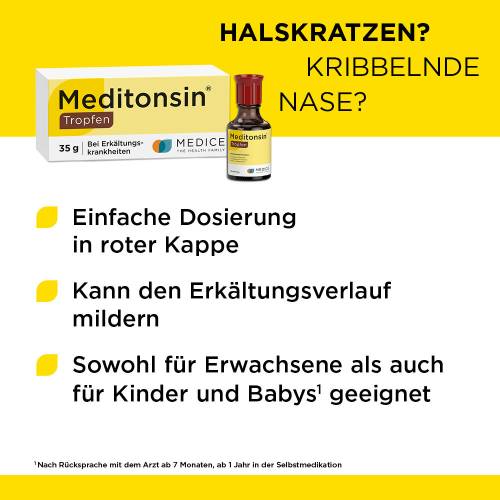 Nach Rücksprache mit dem Arzt kann Meditonsin® bereits Säuglingen ab sieben Monaten verabreicht werden. Kleinkinder ab einem Jahr dürfen auch in der Selbstmedikation mit Meditonsin® behandelt werden.