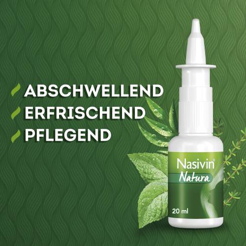 - INHALT: 1x Nasivin® Natura, abschwellendes Nasenspray mit Inhaltsstoffen, die zu 97 % natürlichen Ursprungs sind, hypertonische Salzlösung mit befeuchtendem ProVitamin B5, ätherischen Ölen aus Menthol, Eukalyptus und Thymian natürlichen Ursprungs, 20 ml