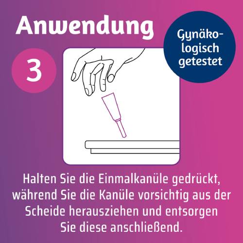 Bei der Anwendung kann eine geringe Menge aus der Vagina ausfließen oder ein Rest in der Kanüle verbleiben. Dank der sehr guten Absorption bleibt die erforderliche und ausreichende Menge im zervikovaginalen Bereich zurück. Die Wirksamkeit der Behandlung wird dadurch nicht beeinflusst. Für das eigene Wohlbefinden können nach der Anwendung Binden oder Slipeinlagen benutzt werden.