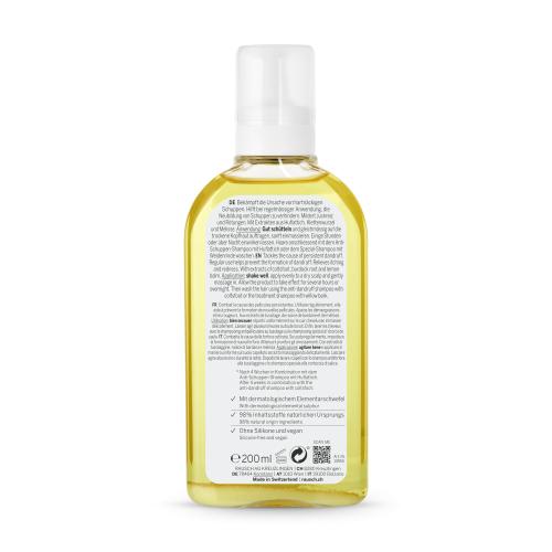 Die Anti-Schuppen-Kopfhaut-Lotion mit Huflattich befreit mild und nachhaltig von trockenen Schuppen und juckender Kopfhaut. Zudem mildert sie den Juckreiz und reduziert Rötungen. Angereichert ist die Spezialpflege mit dermatologischem Elementarschwefel. Dieser kann dank seiner antibakteriellen Eigenschaften dabei helfen, die Haut zu beruhigen und zu klären. Seine kleinen Partikel sind optisch erkennbar und senken sich zum Flaschenboden ab – vor der Anwendung muss die Lotion deshalb kräftig geschüttelt werden. Anschliessend mit dem praktischen Dosierapplikator scheitelweise gezielt auf die betroffenen Stellen auftragen. Die Lotion wird idealerweise einige Stunden oder über Nacht auf der Kopfhaut belassen und danach wieder ausgespült. Sie fühlt sich sofort angenehm erfrischt und beruhigt an.