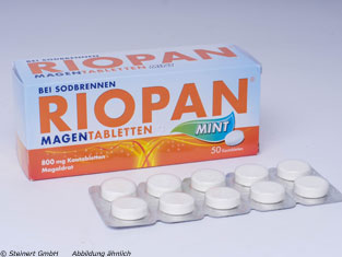 Die bewährten RIOPAN Magen Tabletten zur Anwendung bei Sodbrennen und säurebedingten Magenbeschwerden gibt es auch mit Mint-Geschmack für ein frischeres Atemgefühl. Zudem wird durch das in RIOPAN Magen Tabletten Mint enthaltene Aroma der Speichelfluss angeregt, so dass sich die Tablette besonders angenehm kauen und schlucken lässt. Pro Kautablette sind ebenfalls 800 mg Magaldrat enthalten. Bei Bedarf können mehrmals täglich 1-2 Kautabletten von Erwachsenen und Kindern ab 12 Jahren eingenommen werden, wobei eine Tagesdosis von acht Kautabletten nicht überschritten werden sollte.
