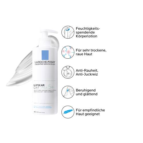 LIPIKAR Lait Urea 5+ für sehr trockene und zu Psoriasis neigende Haut Die Bodylotion mit Urea versorgt trockene Haut mit intensiver Feuchtigkeit, während sanfte Peeling-Wirkstoffe die Hautoberfläche glätten und ein angenehm geschmeidiges Hautgefühl hinterlassen. Rötungen, Juckreiz und Spannungsgefühle mildert die Urea Creme bereits nach der ersten Anwendung. Zusätzlich stärkt sie nachhaltig die natürliche Hautschutzbarriere. Körpercreme mit exzellenter Hautverträglichkeit Die La Roche Posay LIPIKAR Lait Bodylotion ist dank beruhigender Wirkstoffe, wie Allantoin und Thermalwasser, optimal für sehr sensible und zu Psoriasis neigende Haut geeignet – auch bei Menschen mit Diabetes.
