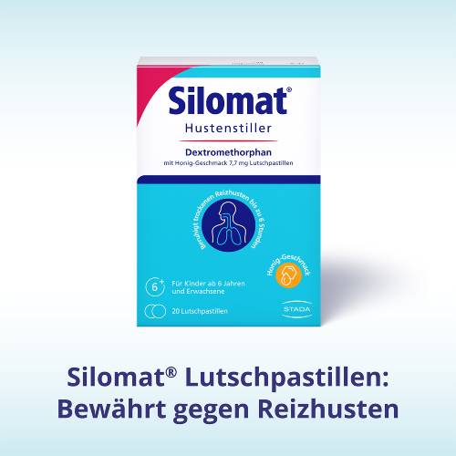 Silomat® DMP gegen Reizhusten 10,5 mg pro Lutschpastille Zur Anwendung bei Kindern ab 6 Jahren und Erwachsenen Wirkstoff: Dextromethorphanhydrobromid-Monohydrat. Zur symptomatischen Behandlung von Reizhusten. Bei Reizhusten handelt es sich um einen trockenen Husten, bei dem kein Schleim abgehustet wird (unproduktiver Husten). Hinweis: Nicht mehr und nicht länger anwenden als empfohlen. Enthält Invertzucker (aus Honig), Maltitol und Cyclodextrin(e). Zu Risiken und Nebenwirkungen lesen Sie die Packungsbeilage und fragen Sie Ihren Arzt oder Apotheker. STADA Consumer Health Deutschland GmbH, Stadastraße 2–18, 61118 Bad Vilbel Stand: Mai 2022