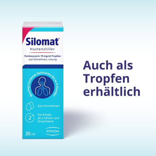 Der Wirkstoff in Silomat® gegen Reizhusten Pentoxyverin Saft dämpft die Wahrnehmung des Hustenreizes. So können sich die Schleimhäute in den Bronchien erholen und auch Sie finden wieder zur Ruhe. Die Wirkung tritt nach 10-20 Minuten ein und hält bis zu 6 Stunden an. Die Einnahme eignet sich daher auch ideal vor dem Schlafengehen. Dank der guten Verträglichkeit sind die Tropfen bereits für Kinder ab 2 Jahren zugelassen.