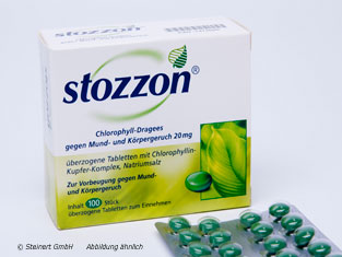 Stozzon Chlorophyll- Dragees gegen Mund- und Körpergeruch. Für Erwachsene und Jugendliche ab 12 Jahren. Wirkstoff: Chlorophyllin-Kupfer-Komplex, Natriumsalz. Anwendungsgebiete: Traditionell angewendet zur Vorbeugung gegen Mund- und Körpergeruch. Beim Auftreten von Krankheitszeichen sollte ein Arzt aufgesucht werden. Warnhinweise: Enthält Saccharose und Lactose.